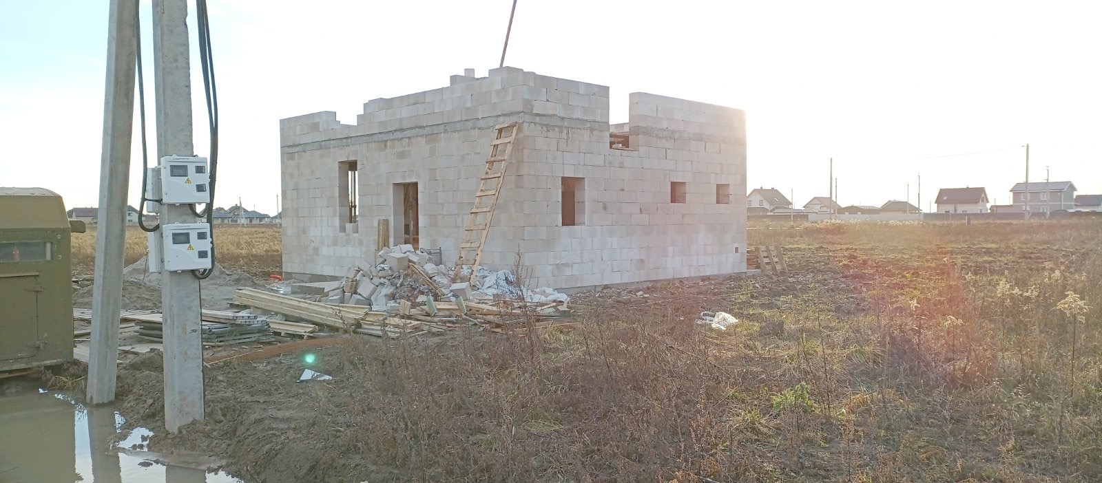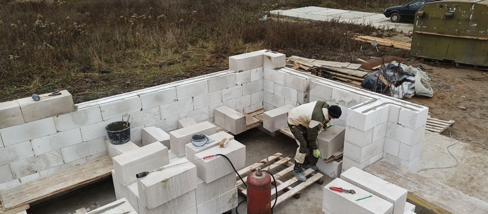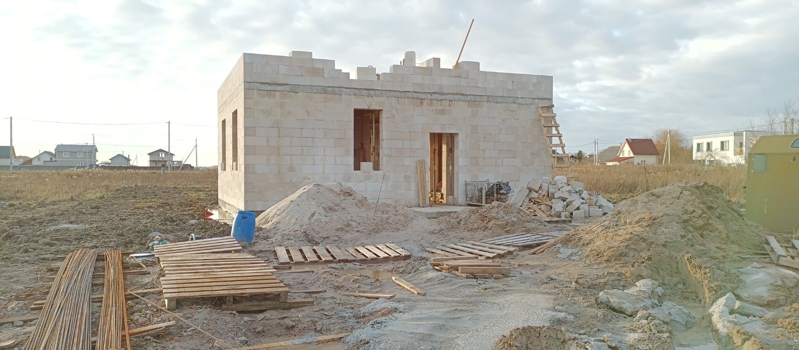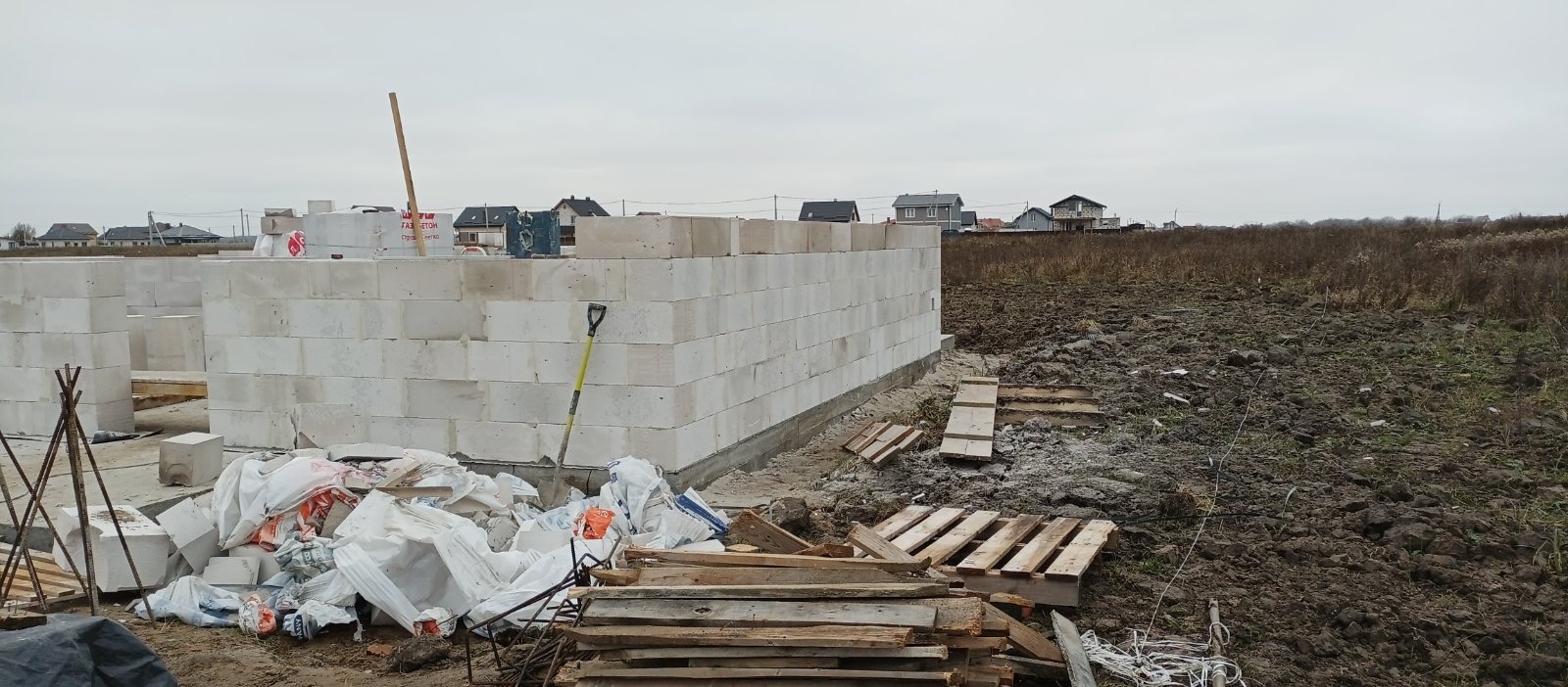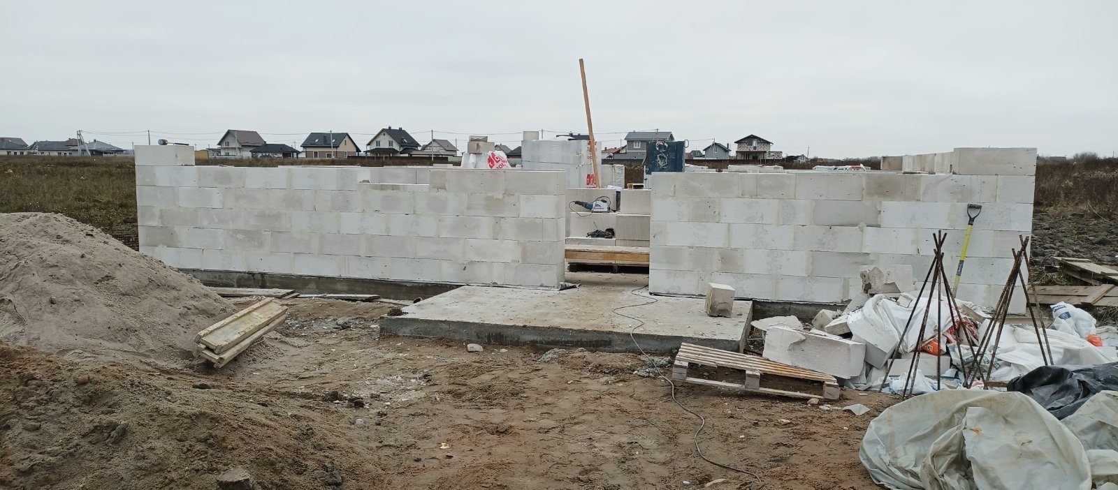 Приступили в межсезонье к строительству небольшого загородного дома в п. Каменка. Фундаментная плита была уже залита, поэтому начали с кладки стен. Закончили строительство "коробки" в конце февраля 2023г. Летом закончили фасад и благоустройство.