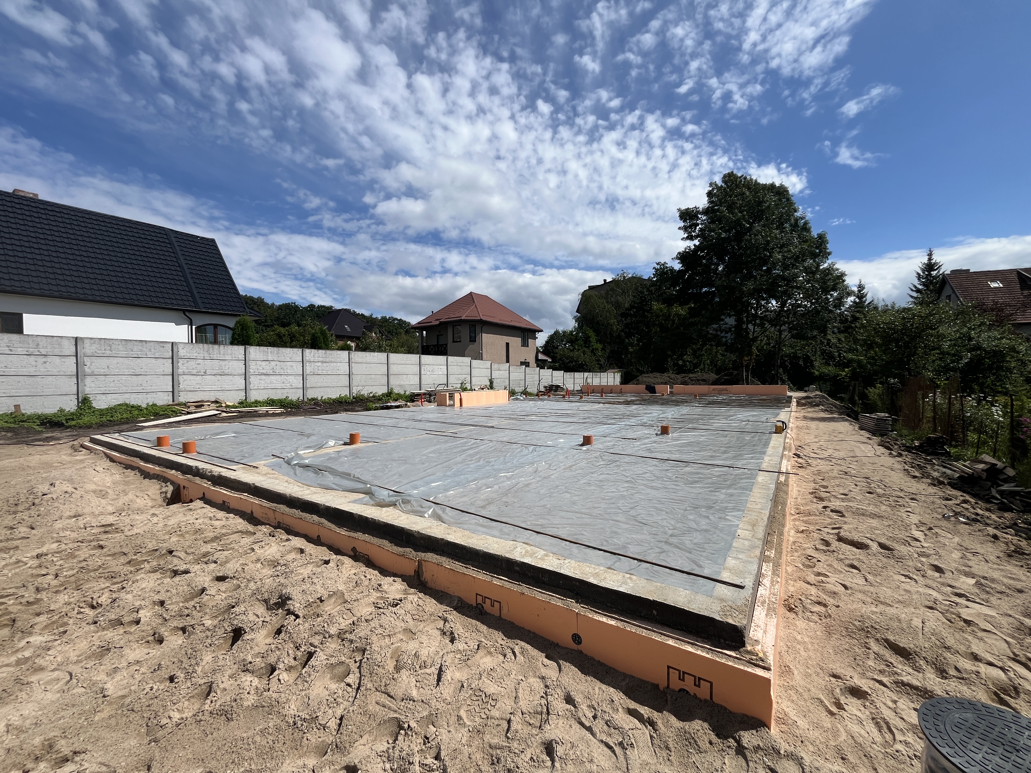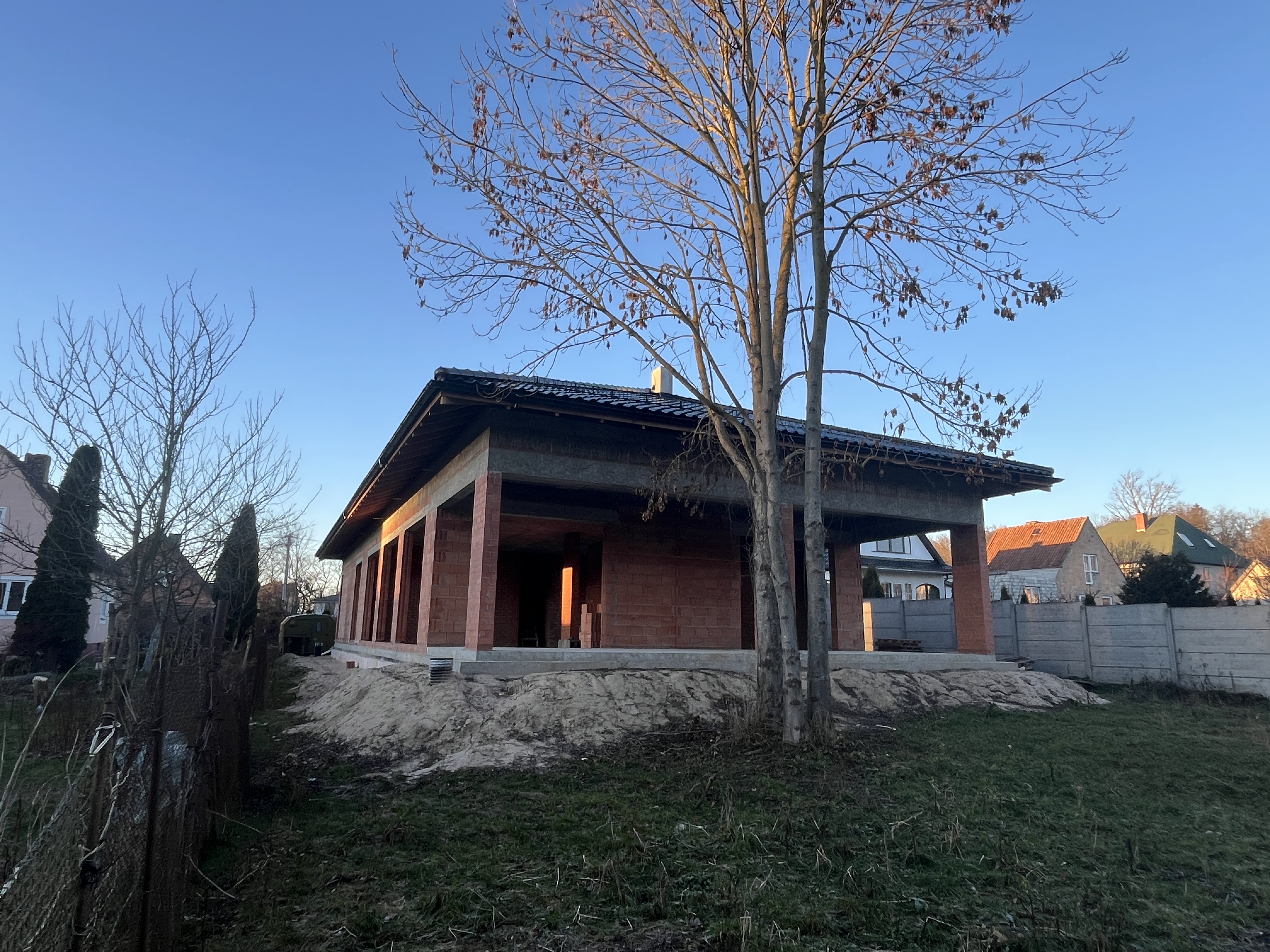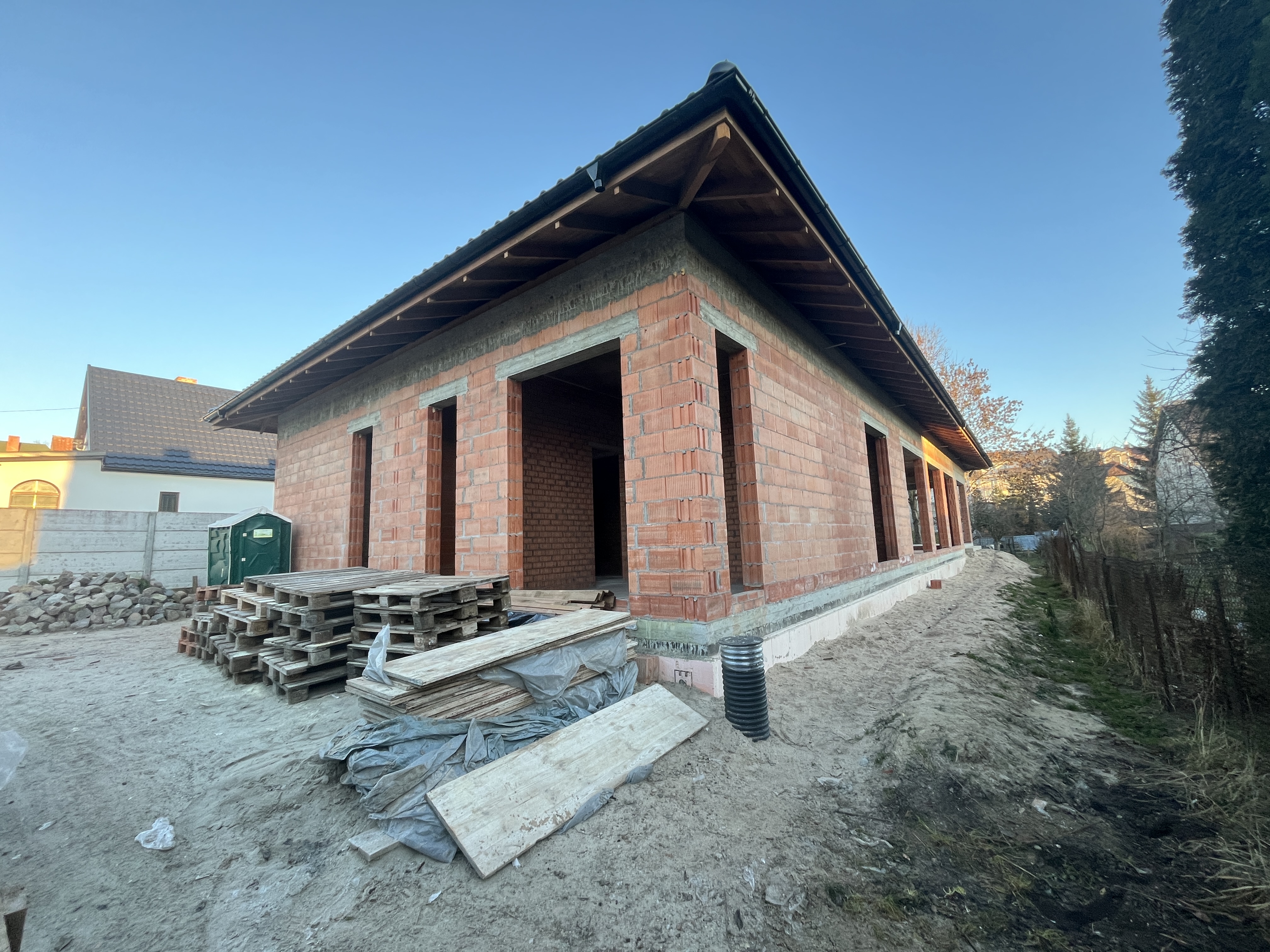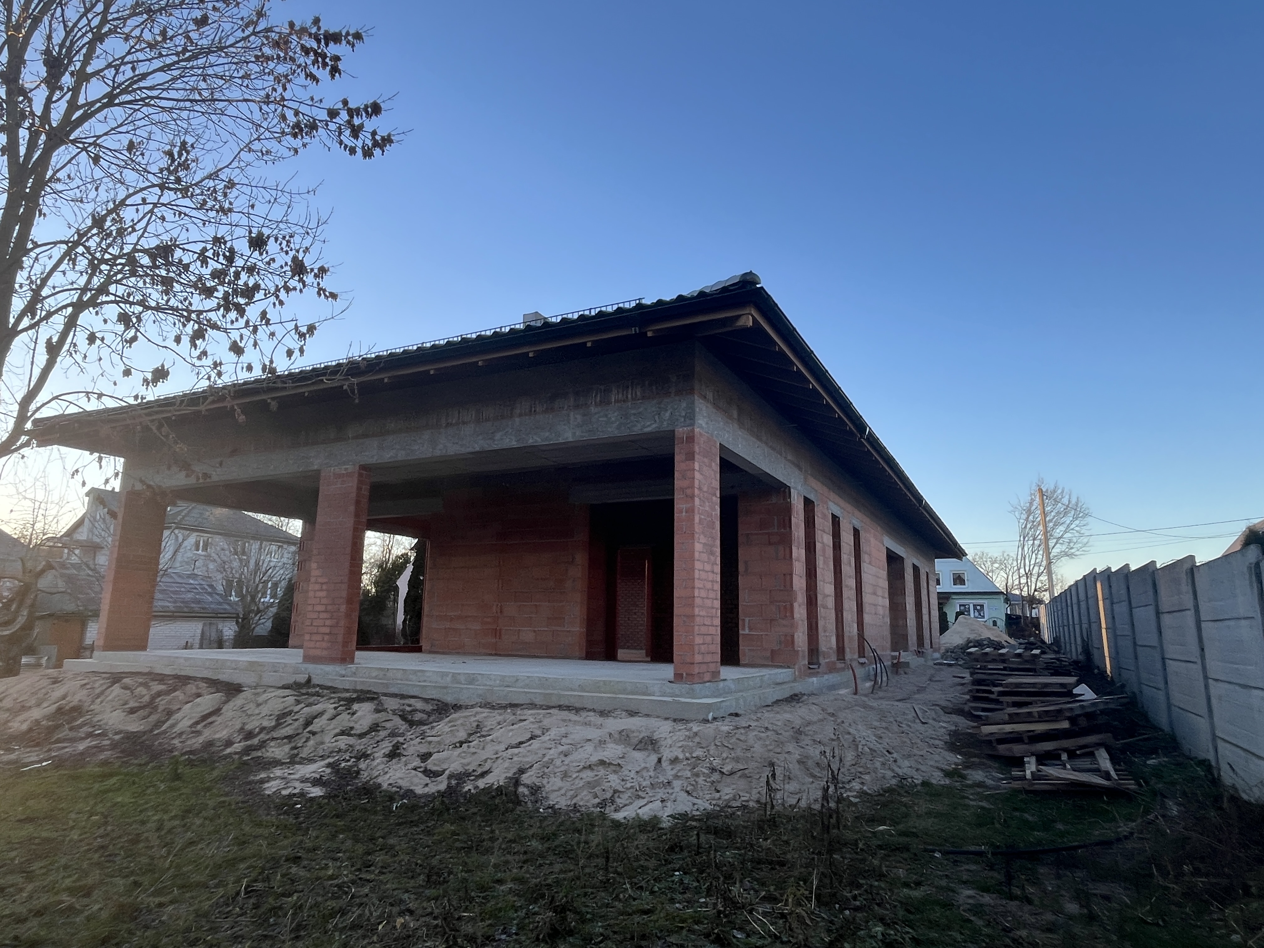 Выполнили строительство одноэтажного дома с большими панарамными окнами, высота потолков 3,7м. Кровля вальмовая, из качественной немецкой керамической черепицы.
